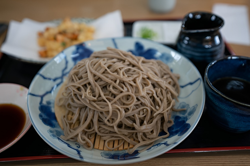 It is located about 2 km from the red buckwheat flower field, where you can taste soba made directly from the fields. Kario Chaya put effort into the milling method for the aroma and smoothness of the soba. They also use Hon-wasabi, unique to the local and seasonal vegetables, for their tempura, valuing the flavors of the region. Their rich and slightly sweet broth perfectly complements the soba, making it a dish that will leave customers endlessly happy. The menu includes *Morisoba (盛そば), *Kakesoba (かけそば), Tempura Morisoba (天ぷら盛そば), and Tempura Kakesoba (天ぷらかけそば). As a side note, extra-large sizes are only available on weekdays. Their specialty black bean rice balls (黒豆むすび) are often sold out, so consider yourself lucky if you manage to buy them. When ordering, use the vending machine and select your items using the buttons. Make sure to have cash ready!