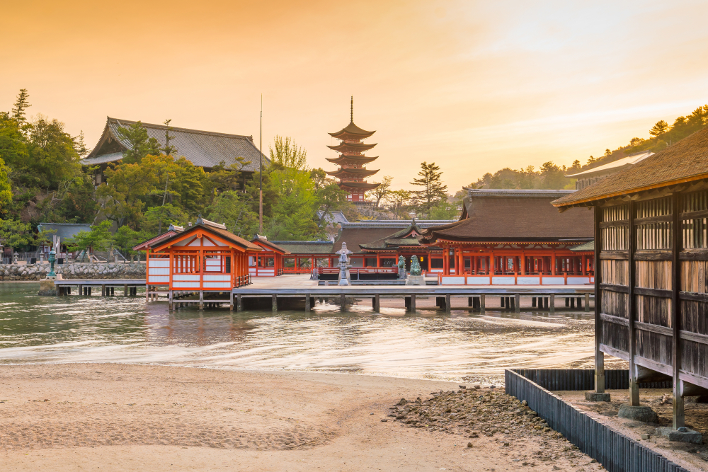 Itsukushima Shrine and its floating torii over calm water – Photo Credit: Sean Pavone
