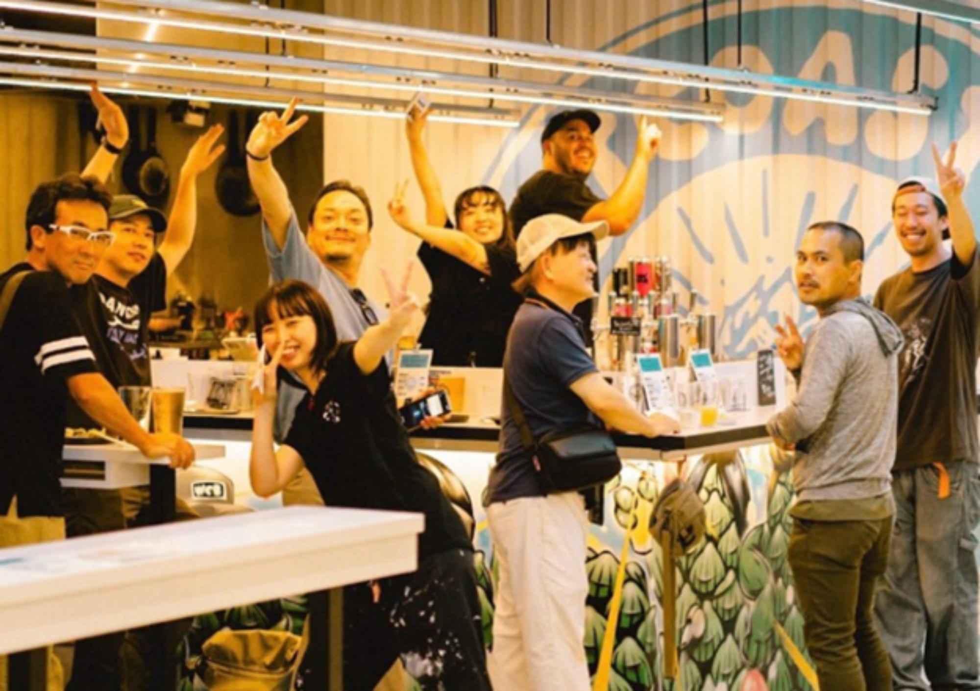 WCB staff posing for a picture in front of their bar – Photo Credit: West Coast Brewing Umeda