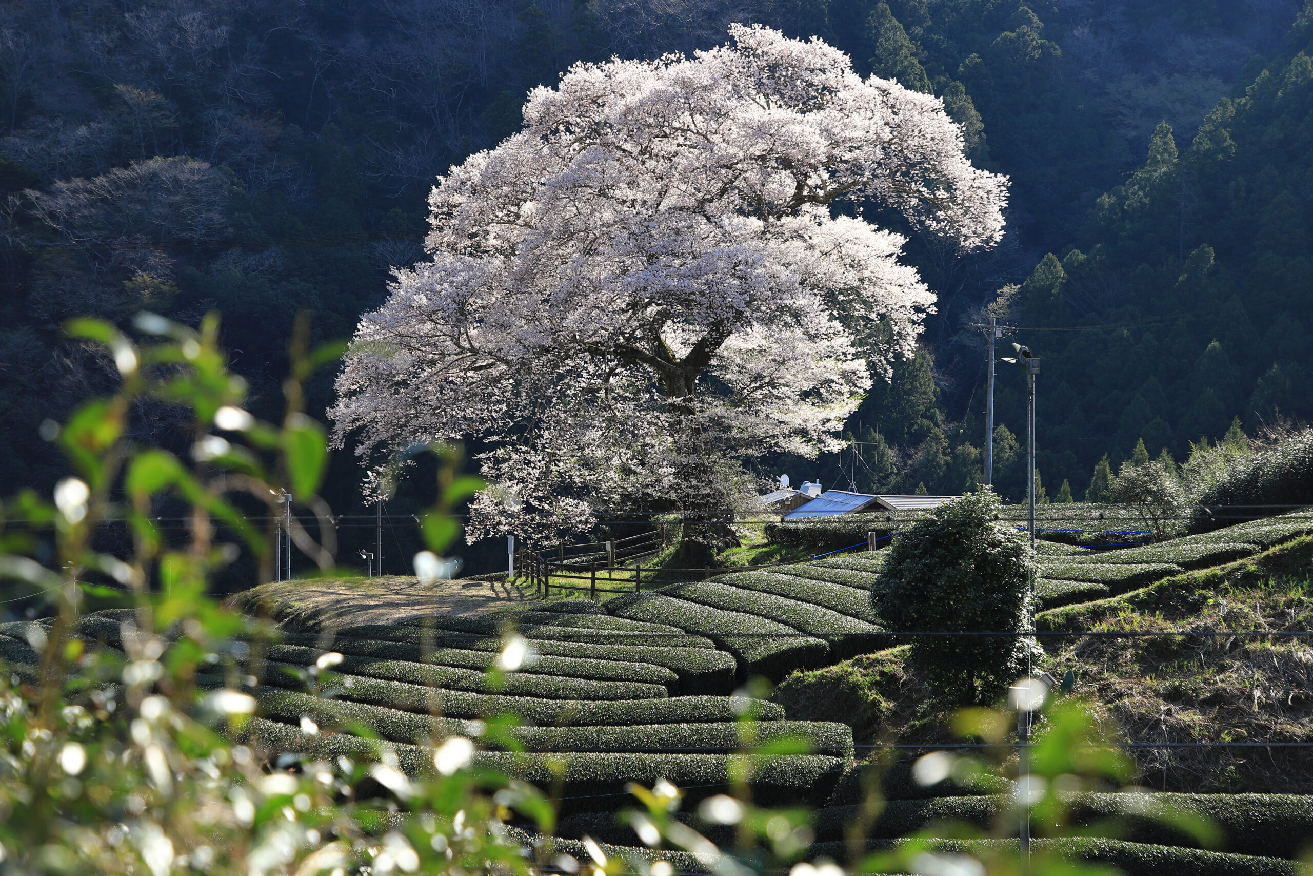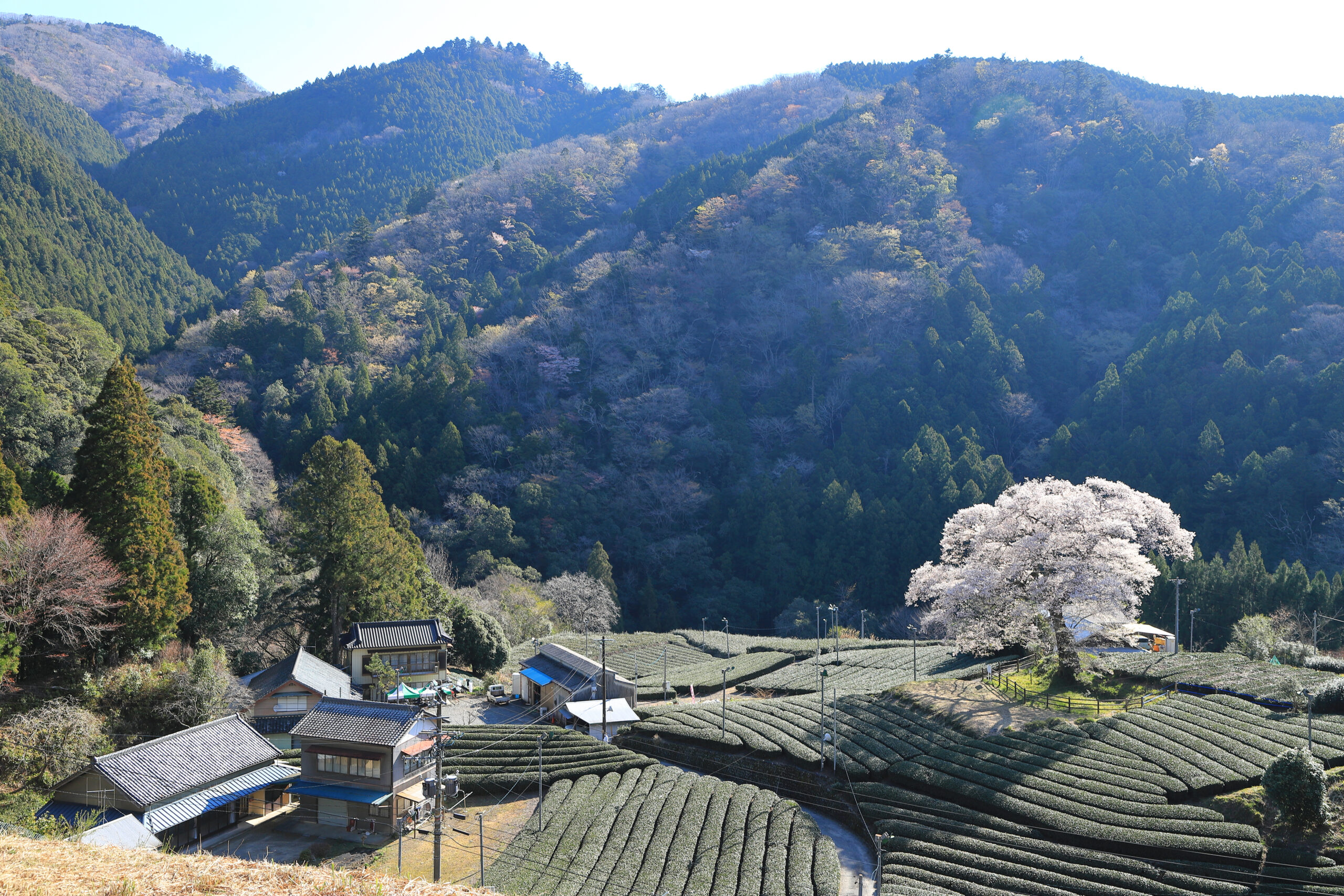 The Ushinoshiro Mizume Tree is celebrated for its solitary grandeur. This “lonely” cherry tree stands 20 meters tall in the center of a tea field in Kawane village. At approximately 300 years old, it has been designated a natural monument. As the tree is located on private property, please remain respectful while viewing it. The contrast of the ancient pink blossoms against the deep green tea plantation and towering mountains is truly breathtaking.