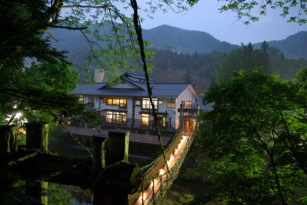 One of the most extraordinary features of Honke Bankyu is the Kazura Bridge that connects the main building to the inn’s restaurant. The vine bridge was inspired by those used by soldiers in the region during the 17th century. The most luxurious room at Honke Bankyu is the “Aioi” room that features a private, riverside bath and a view of the Miyama River Gorge.