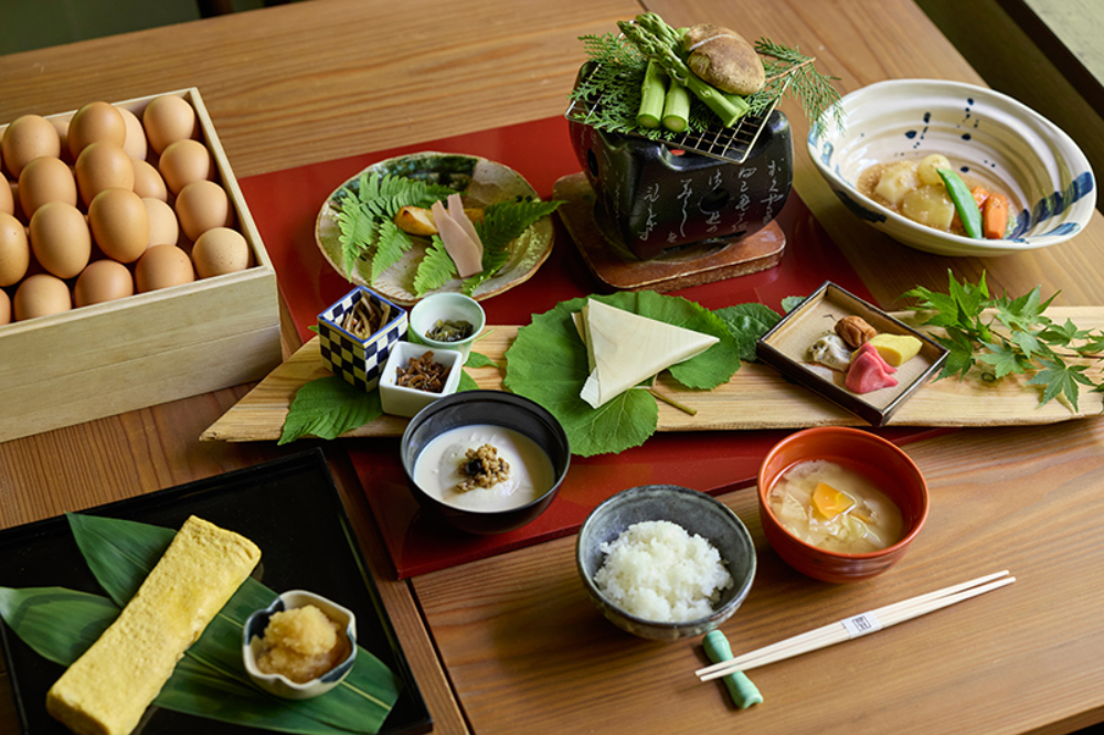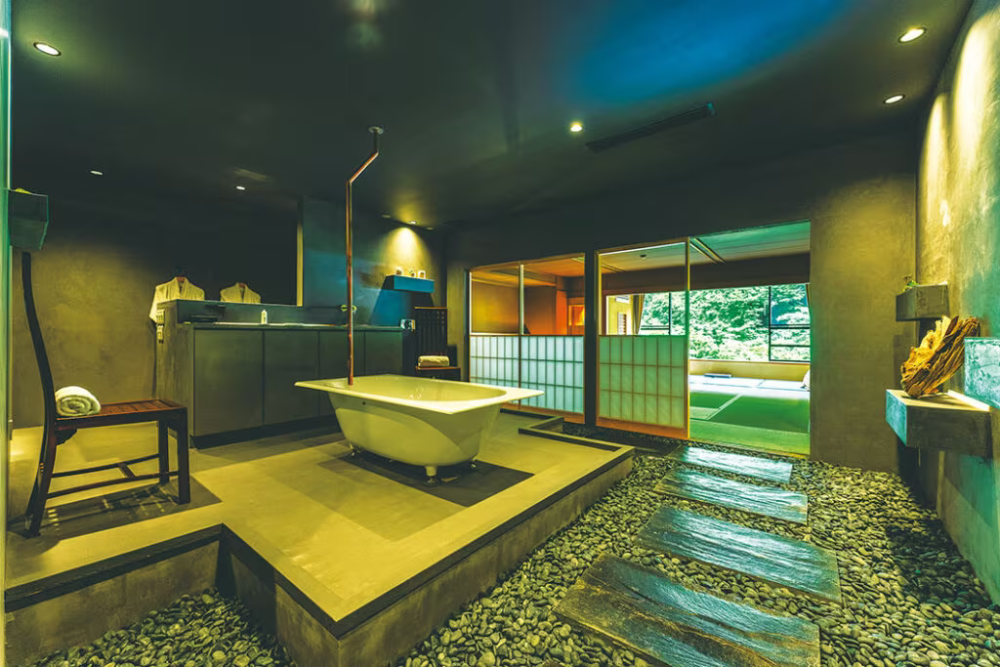 This green image is at the heart of everything in Myojinkan. The cuisine on offer is based around the philosophy of Shindo Fujitsu (macrobiotics) and features organic rice and vegetables cultivated at a nearby farm by the staff themselves. The ryokan’s motto is to “luxuriate in doing nothing.” Most of the rooms do not include TVs and are designed with Zen and nature in mind. One of the most unique suites is the “Zen SPA Living” room. A fusion of Western and Japanese aesthetics, the design of the space emulates a mossy stream flowing through the mountains and features a large, Western tub.