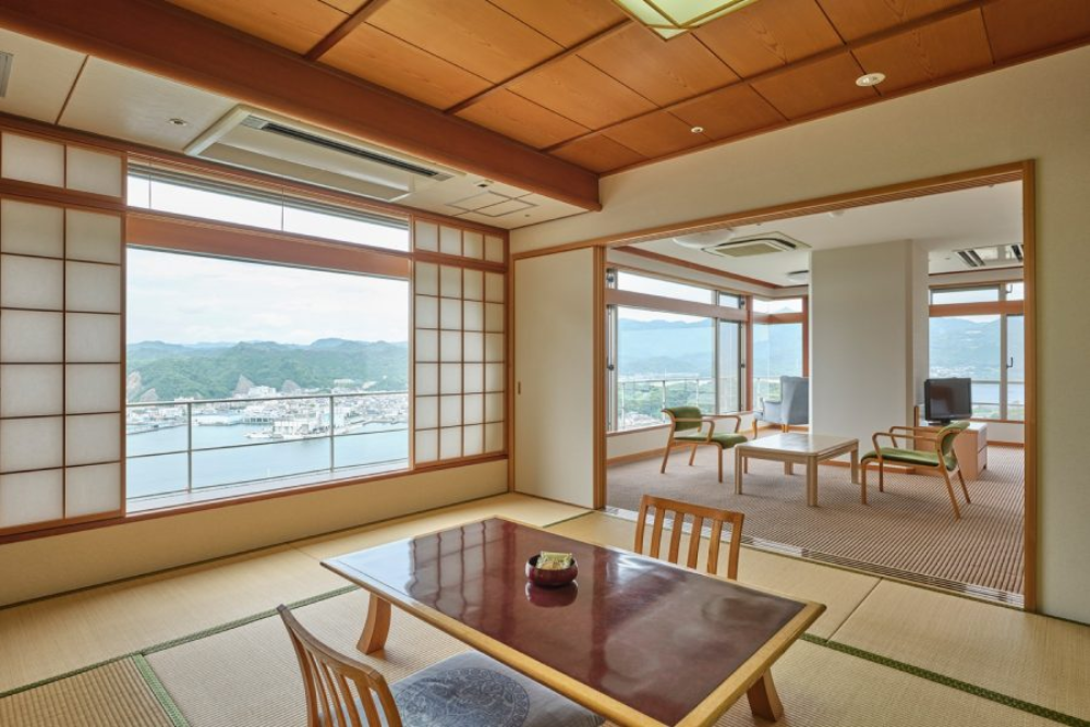 As time goes by and as more and more guests prefer modern conveniences to traditional stays, the line between ryokan and Western hotel has begun to blur. As luxury is a subjective term, there are people out there who may prefer a bed over a futon. Nowadays, many ryokan have built or renovated Western-style rooms to accommodate everyone’s preferences. One such ryokan is Hotel Urashima in Wakayama. Traditionally, ryokan are quite small with only a few rooms. Hotel Urashima, however, has almost 400 rooms that come in seven different styles. Guests can choose between Japanese and Western-style rooms, or opt for a room that’s a fusion of both. The only one of its kind in the hotel, the VIP Room in Urashima’s Yamagamikan building is a Japanese-Western style suite with a spectacular panoramic view of the ocean.