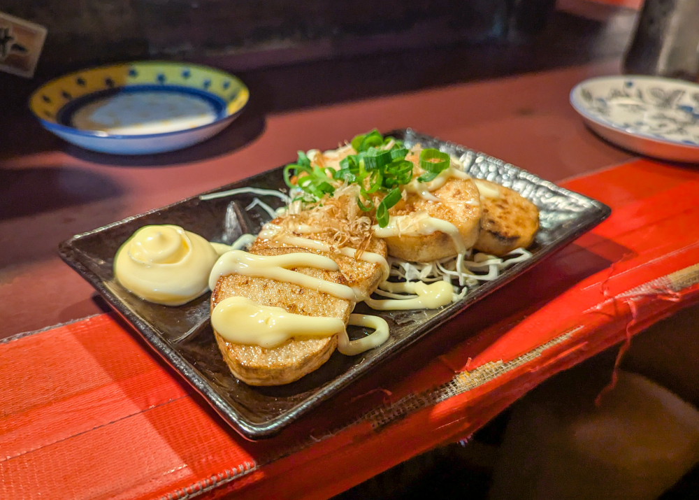 First things first, we had to have a cold beer! As we settled in, we ordered a simple but flavorful starter: grilled yamaimo (Japanese mountain yam) with mayonnaise, the perfect snack while we looked over the menu.