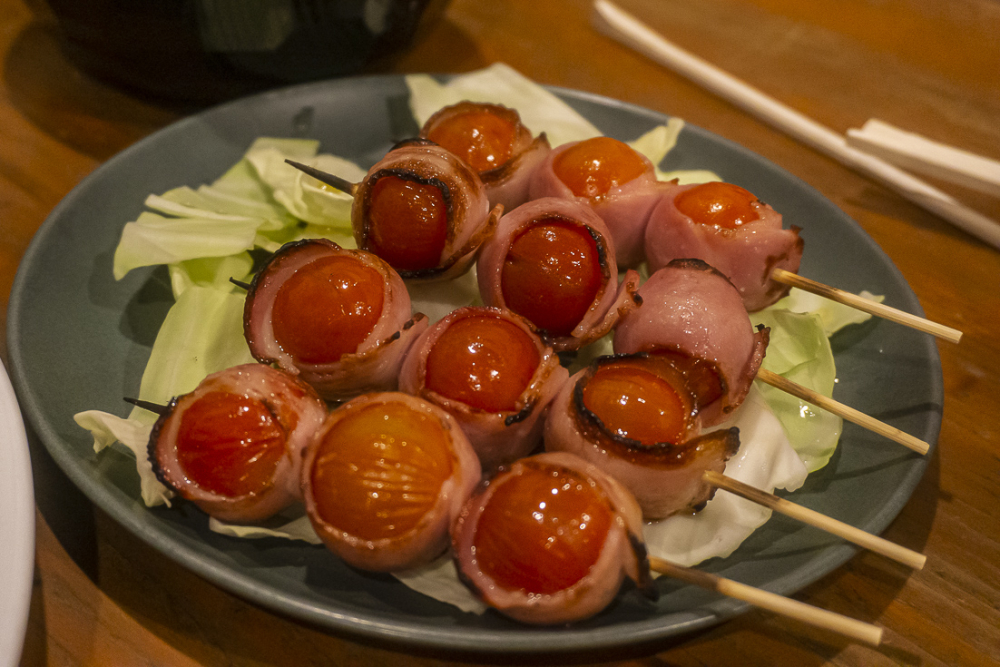 To start the dinner, we enjoyed crisp slices of fresh cucumber served with miso paste. To complement the flavors, we ordered a bottle of “芋焼酎” Imo shochu (芋 (imo) = sweet potato 焼酎 (shōchū) = a traditional Japanese distilled spirit). We then asked the staff for their recommendations, which led us on a flavorful journey: from juicy cherry tomatoes wrapped in bacon, fresh fish carpaccio (Hamachi (はまち) is the Japanese name for young yellowtail fish) in a green salad, to assorted skewers of chicken, pork, and beef, and even a delightful plate of spaghetti topped with a fresh tomato sauce!