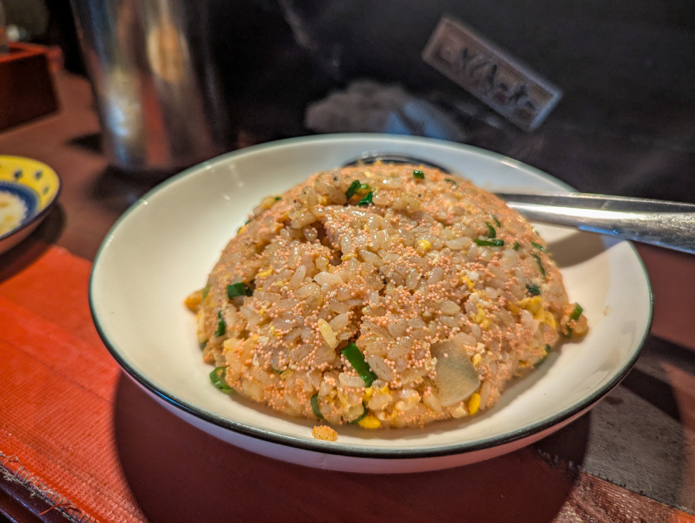 Curious about the local favorites, I asked the staff for their top recommendations. Without hesitation, he mentioned the two most popular dishes among guests: Yaki Ramen (a dry, stir-fried version of ramen) and Mentaiko Meshi (fried rice with spicy cod roe). Despite still being a bit full from lunch, we simply couldn’t resist and ordered both, complementing it with a glass of local Nihonshu (sake) to pair with the flavors.
