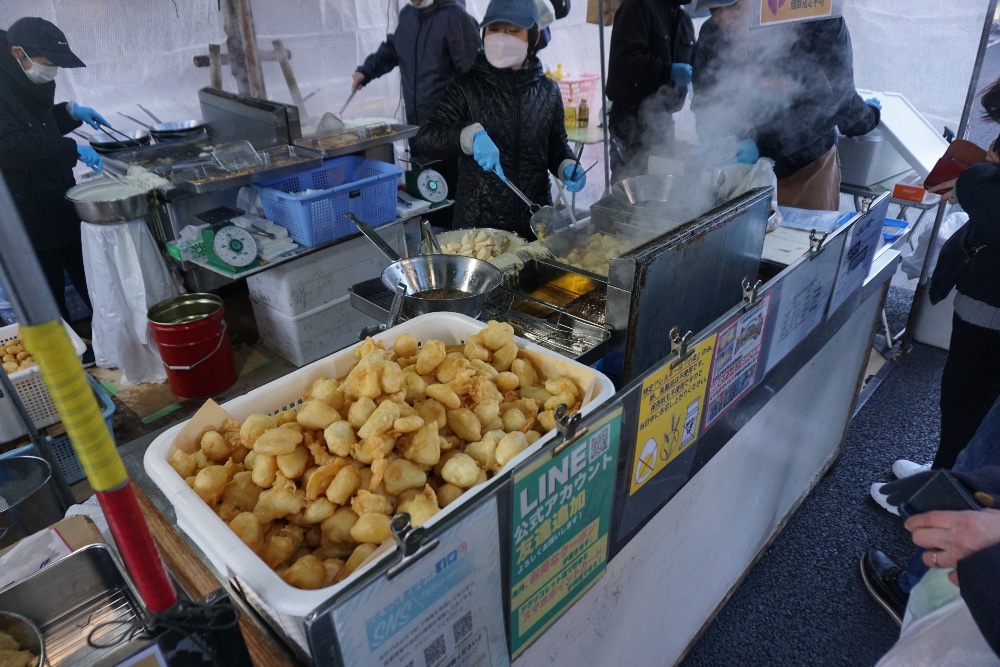 The Hachinohe market is held from mid-March to the end of December and has everything, from fresh seafood and vegetables to bread, noodles, and sweets. When I went there last summer, I had aki kushiyaki (shellfish skewers), dengaku (tofu skewers heated on a grill and topped with miso seasoned with mirin and sugar), ôban’yaki (a kind of stuffed pancake filled with vanilla custard), and tonjiru (miso soup with pork and vegetables) for only 850 yen!