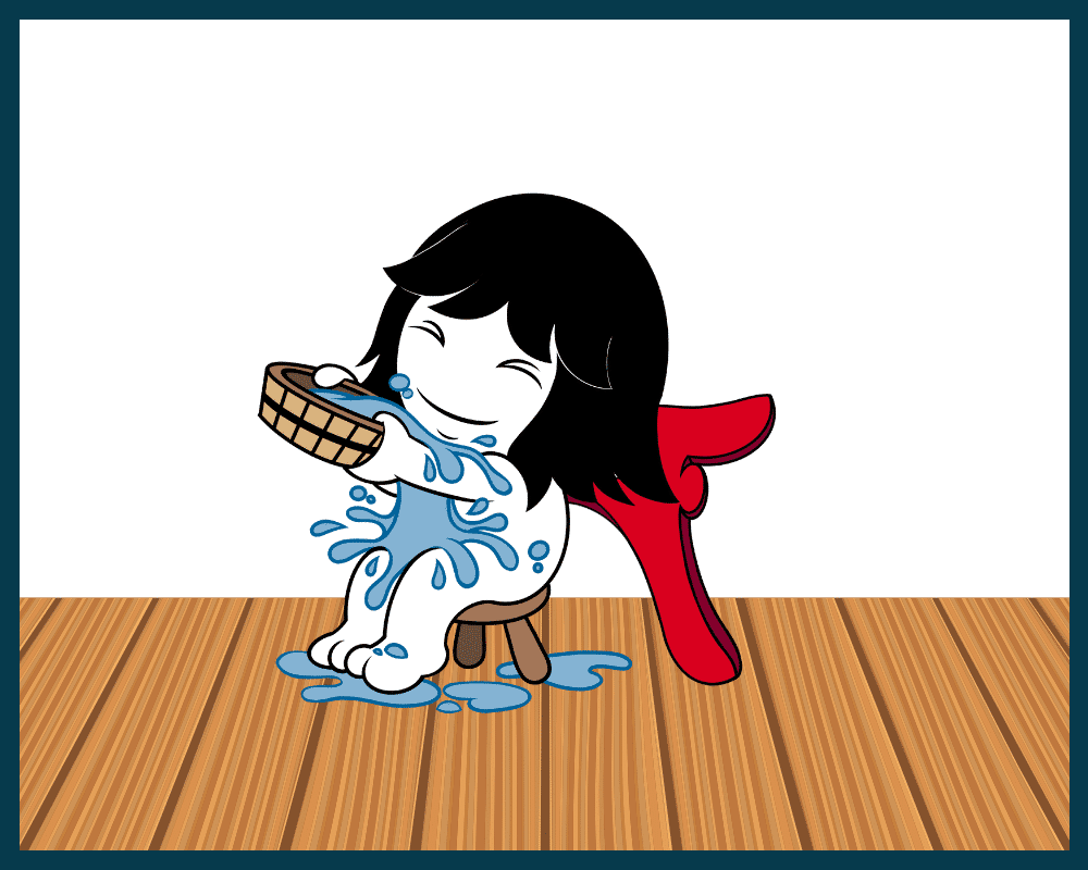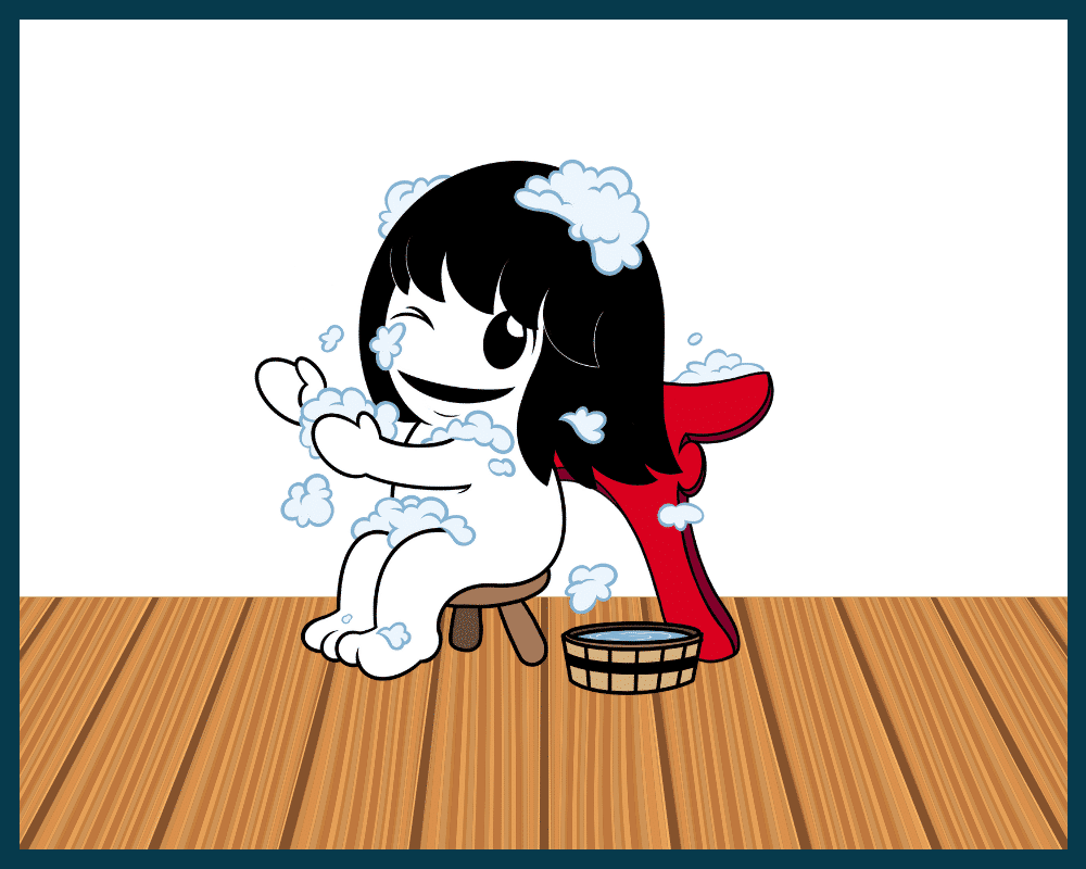 Before you enter the bath, you must wash! You will see cleaning stations equipped with small stools and handheld showers. Uma-chan has grabbed the necessary supplies, so make sure to grab yours too!