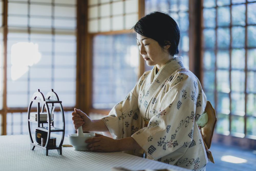 Grinding matcha with a pestle and mortar – Photo Credit Incense Kitchen