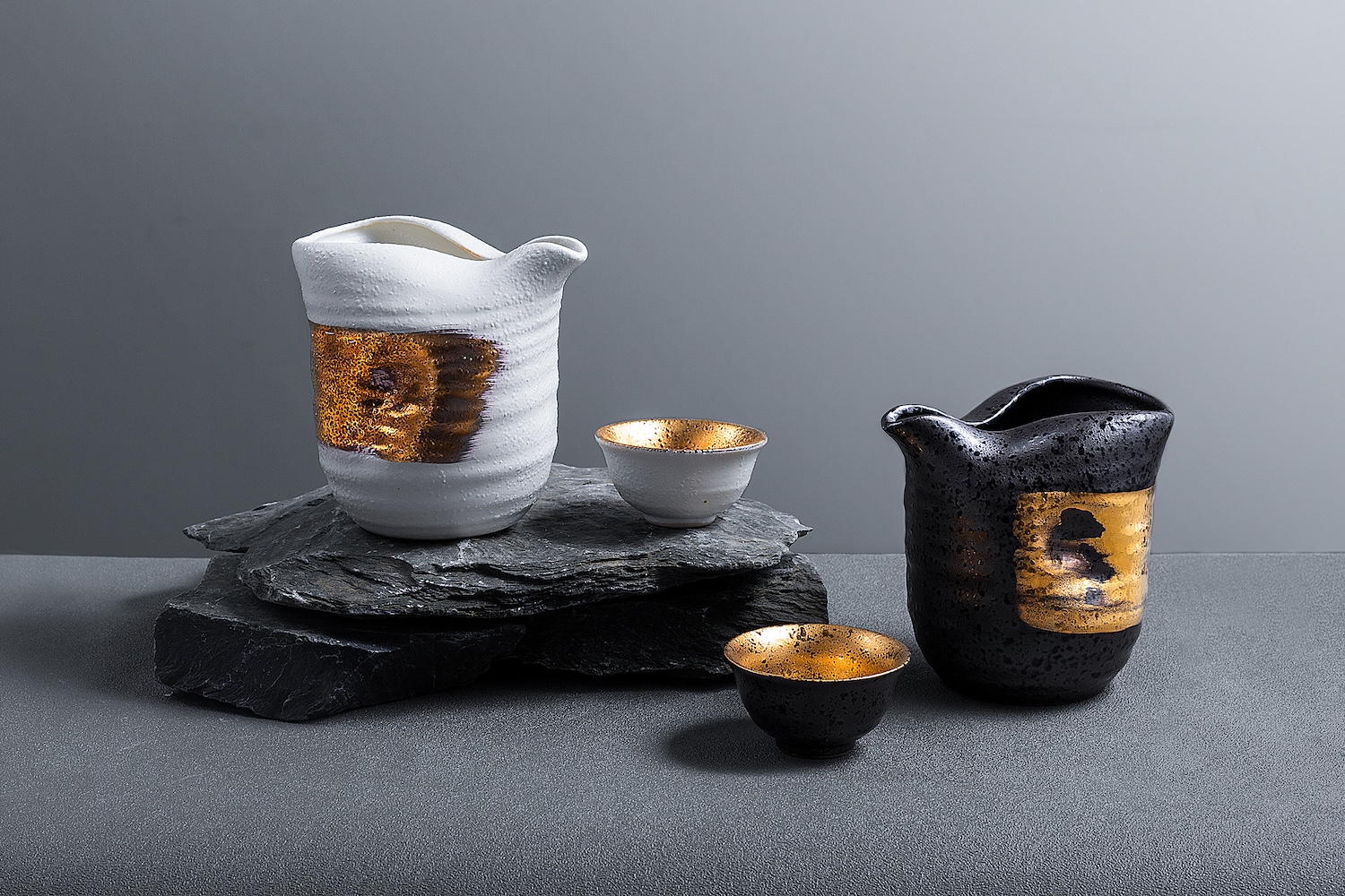 Katakuchi Kinmaki cold sake set (Kurokesshou/Shirokesshou), Yamai pottery Co., Ltd. (Gifu) – Photo Credit: OMOTENASHI Selection