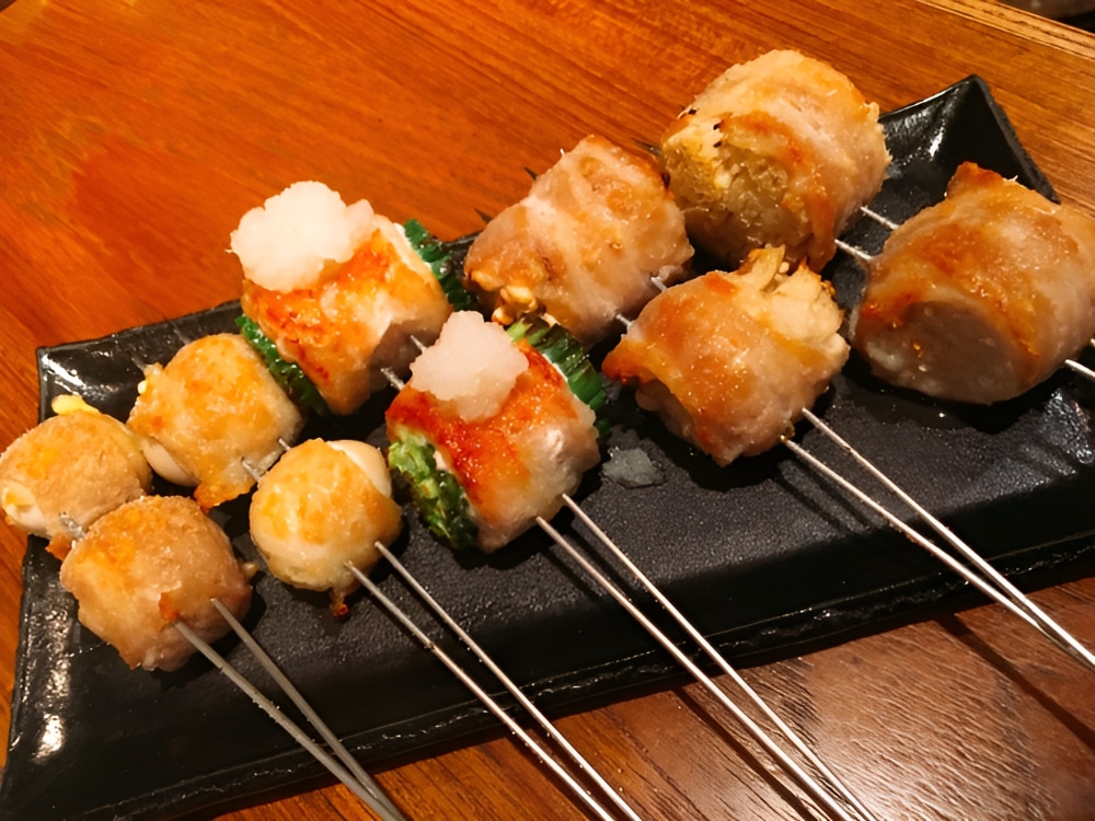 At Kushi Ikka, you can taste specialty dishes such as “Kuwa-yaki” and “Chilled Skewers.” While Kuwa-yaki is similar to Yakitori, it combines several preparation methods, including steaming, frying, and grilling.
