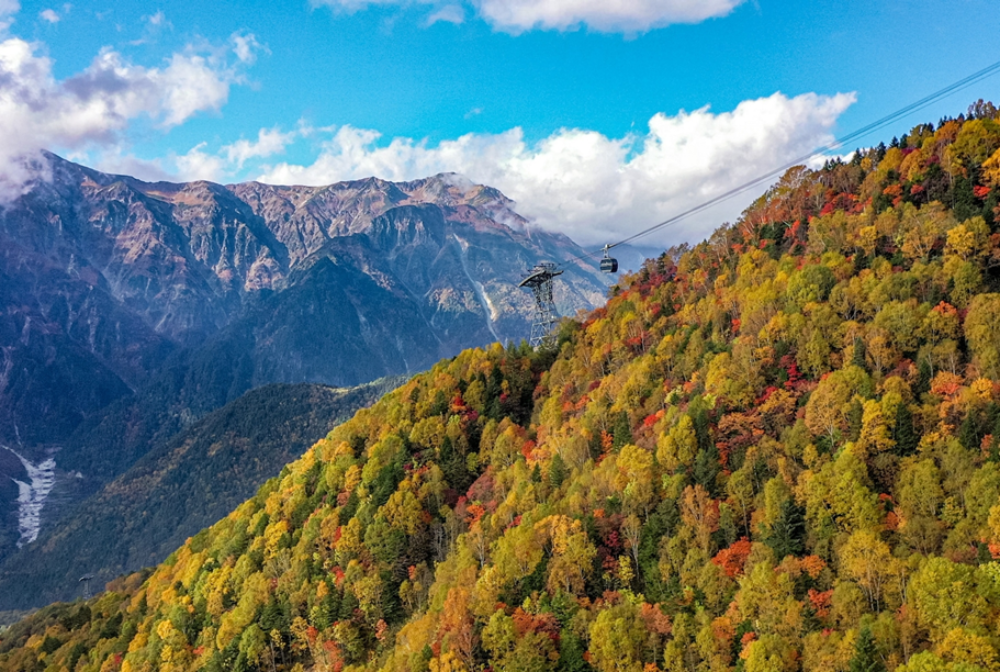 Shinhotaka Ropeway gondola passing over some autumn trees – Photo Credit: Shin-Hotaka Ropeway Official Website