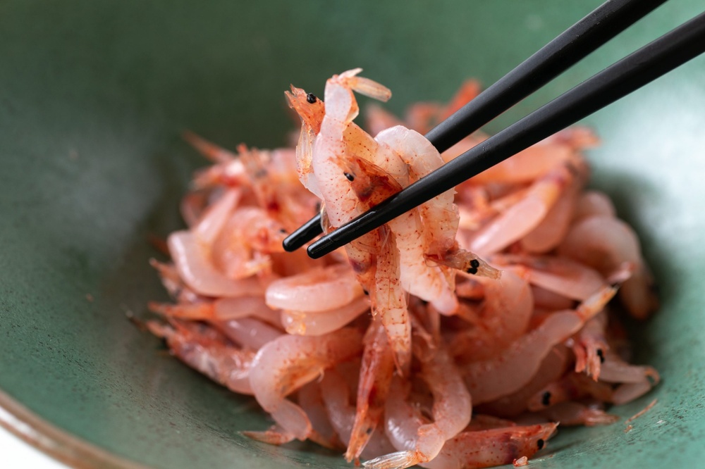 Fresh sakura shrimp being picked up with chopsticks – Photo Credit: Oishii Sangyo