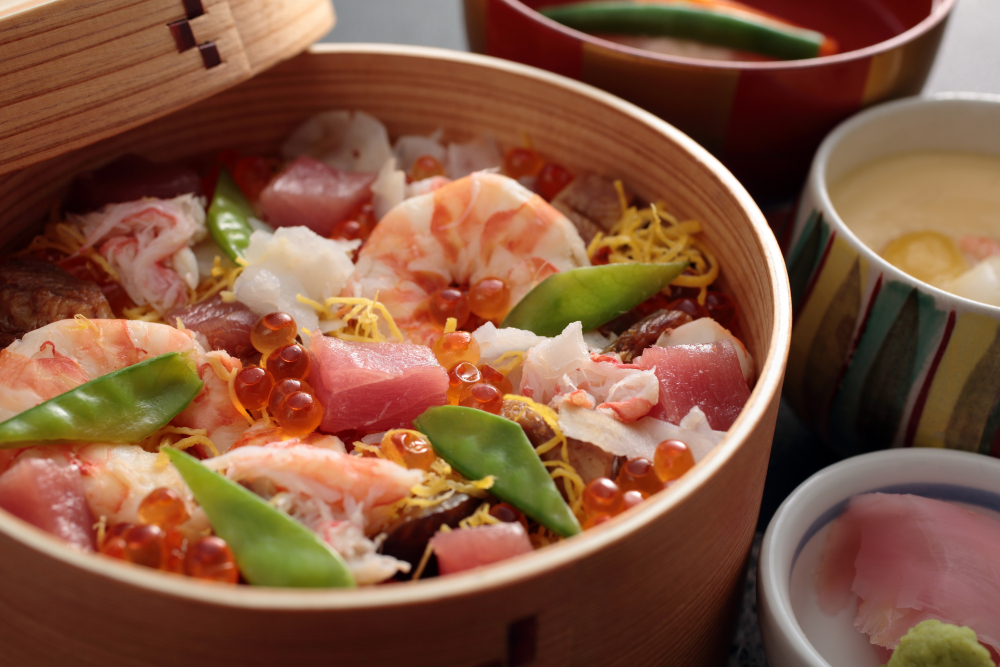 When you hear “sushi,” you might think of Nigiri or Maki sushi, but sushi has many types, such as Inari sushi. This colorful Chirashi sushi is often eaten during “Hinamatsuri,” a festival that celebrates the healthy growth of young girls. In general, the ingredients differ by region. For instance, in Western Japan, Chirashi sushi is typically made with cooked or grilled ingredients, while in Eastern Japan, it uses fresh toppings like raw fish on vinegared rice.