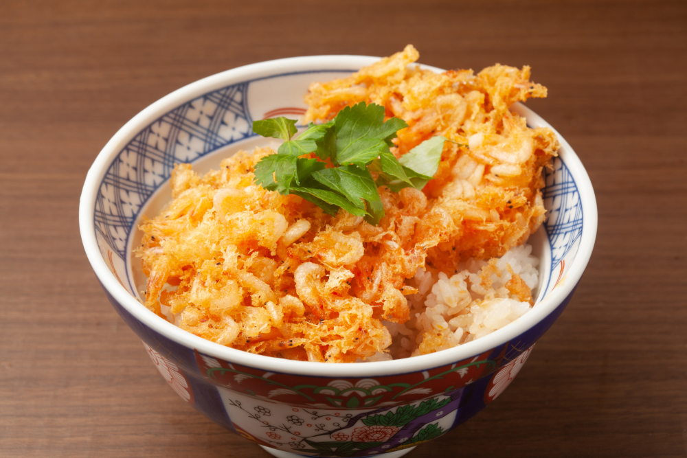 Sakura shrimp kakiage served over rice – Credit: sasazawa