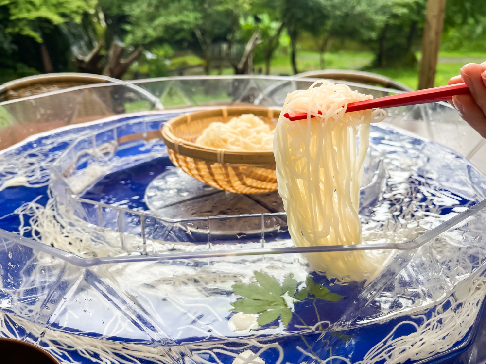 Nagashi soumen is one of the most famous summer foods in Japan, which is thin noodles made from wheat flour, boiled, and then served by sending them down a stream of cold water through bamboo. Unlike udon, ramen, or soba, these noodles are incredibly thin and easy to swallow, making them a perfect dish when you get sick from the heat. While you can enjoy soumen without the flowing water, the bamboo style adds an extra touch of coolness. So it is a must-try to refresh the summer experience!!