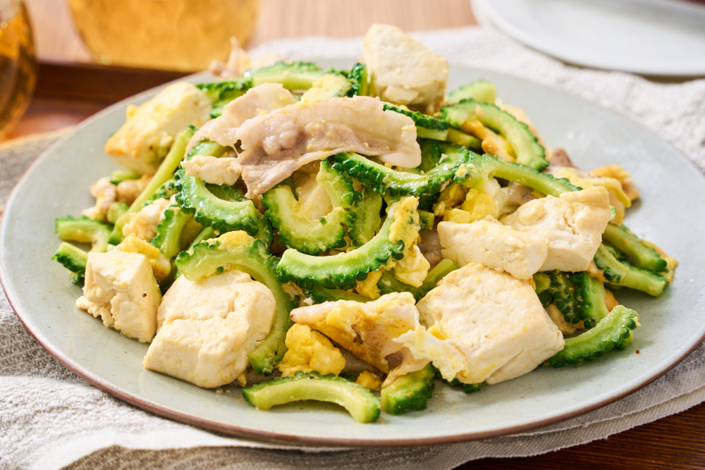 Okinawan Goya Champuru with goya, tofu, egg, and pork – Credit: karins