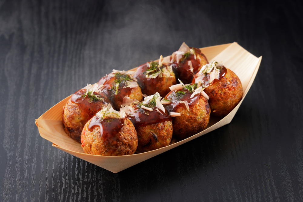 Fresh takoyaki served in a traditional boat-shaped tray – Credit: Nishihama