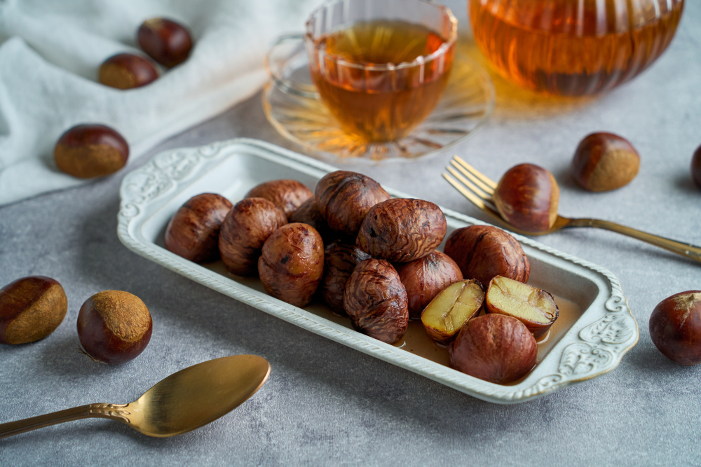 Maron is in season from September to October and often warms up home dining, especially Maron rice. Generally, Japanese Maron are larger, sweeter, and have a fluffy texture compared to Western Maron. I also recommend trying Mont Blanc cakes, as many Japanese cakes blend Western influences with Japanese ingredients and tastes, making them unique and new styles!
