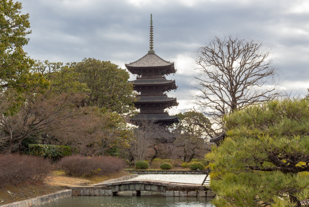 Beautiful gardens and traditional wooden Buddhist pagoda buildings in the gardens of the Tōji Temple – Photo Credit: Jaclyne Ortiz
