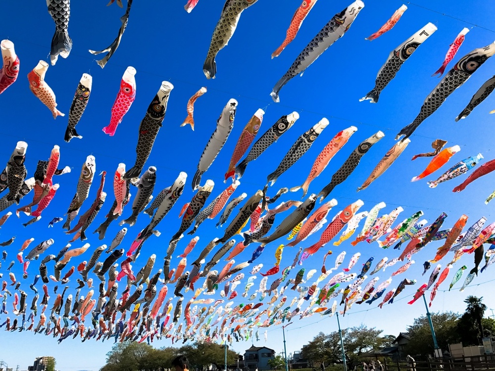 Colorful koinobori streamers dancing across a bright blue sky – Photo Credit: Tabimag