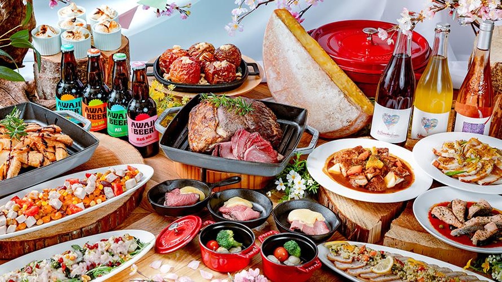 The Sakura Glamping Buffet is a spring-season, limited-time buffet experience held at the Cafe restaurant on the 1st floor of the Grand Prince Hotel Osaka Bay. It offers a unique indoor “glamping” atmosphere with cherry-blossom decorations and a bright, open, glass-walled space where guests can enjoy a fusion of camp-style, outdoor-inspired cooking and refined French bistro cuisine. Highlights include live-cooked roast beef with melted raclette cheese, served in cast-iron skillets; campfire-style desserts such as roasted marshmallows and baked apples; and à la carte drinks, including Awaji craft beers and wines. The buffet runs at lunch and dinner (with pricing differing by day and time), and there’s also a free-flow drink option available. The concept is designed to let diners enjoy the festive spirit of cherry blossom season indoors without worrying about the weather.