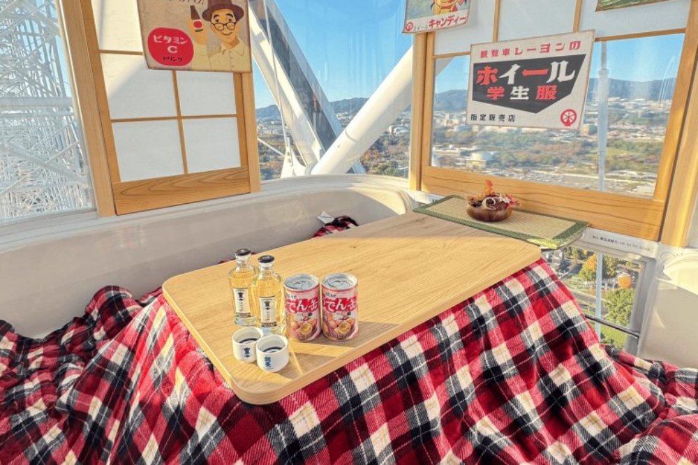 Winter meets whimsy on the Redhorse Osaka Wheel, which features seasonal kotatsu cabins and is also known as the Sky Kotatsu Ferris Wheel. A kotatsu (炬燵) is a traditional Japanese heated table with a blanket, and these special gondolas recreate that cozy experience in the sky. Wrapped in warmth while overlooking the Osaka skyline, this is a memorable way to enjoy the cold season without actually feeling cold.