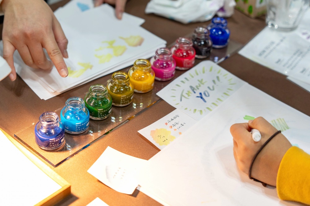 People testing colorful inks at a stationery table – Photo Credit: Bungu Joshi-haku