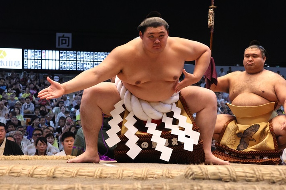 Sumo wrestler performing a ceremonial stance during a match – Photo Credit: JAF