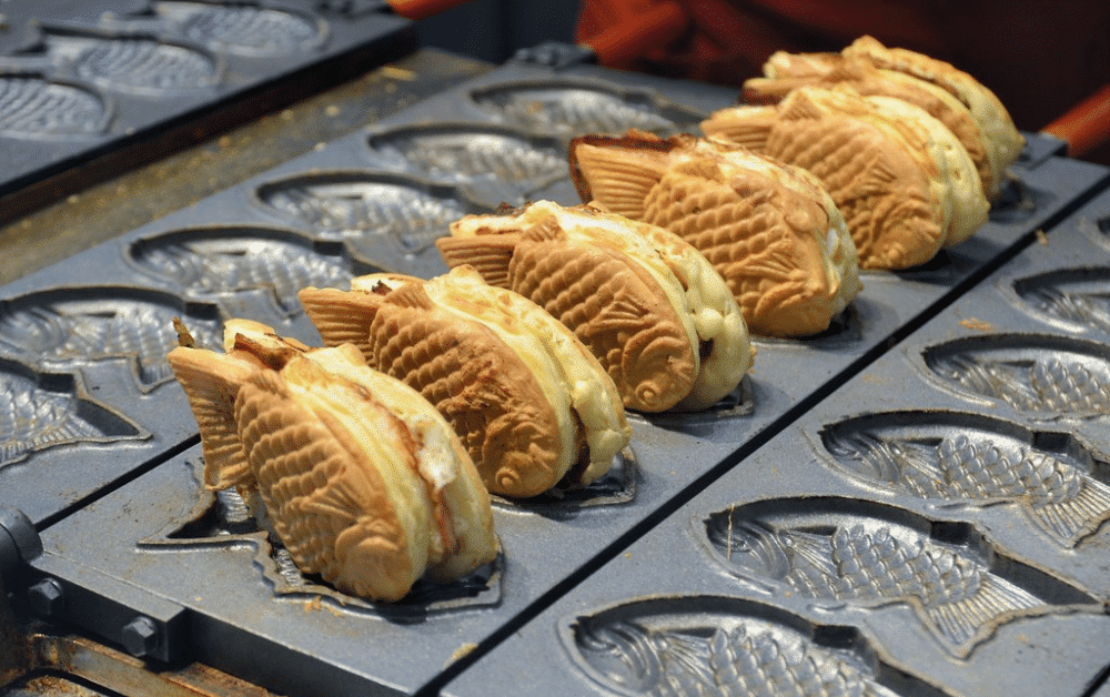 Taiyaki is the famous fish-shaped pastry made from wheat flour and often filled with sweet red bean paste. It’s grilled in a molded iron pan to resemble a red snapper, a fish symbolizing good fortune in Japan. While the shape remains iconic, modern fillings now include custard, chocolate, sausage, matcha, and many more.